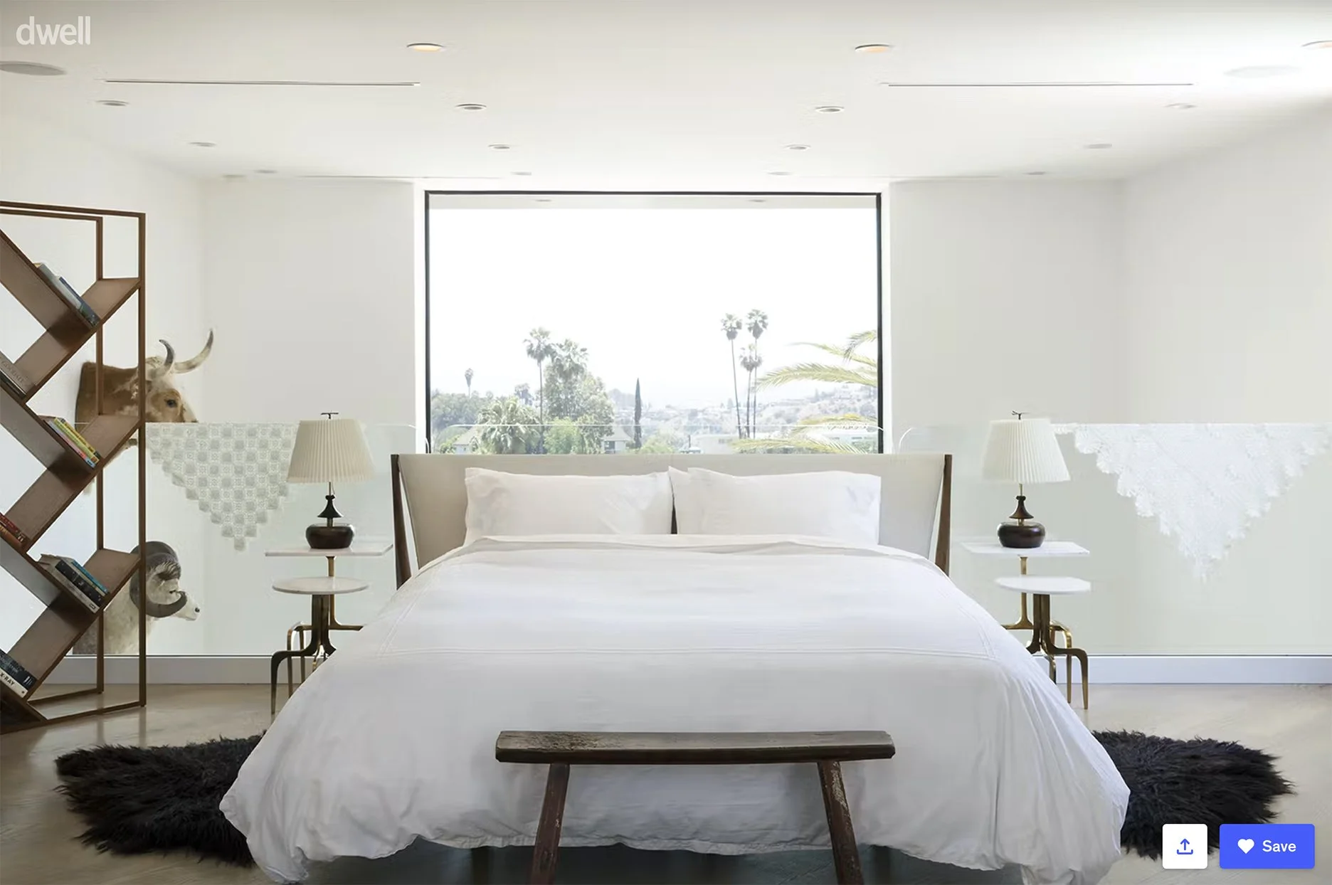 A minimalist bedroom with a large white bed, two nightstands with lamps, a large window showing palm trees outside, a wooden bench at the foot of the bed, black rugs, and shelves with books and decorations, including a checkered cloth and a peek of a cow's head visible on the left side.