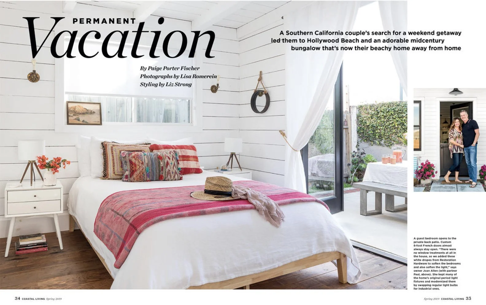 A bright, white bedroom with horizontal shiplap walls, a large bed with white bedding and colorful pillows, a straw hat on the bed, and a lake view patio outside through open sliding glass doors. A couple is standing on the porch, smiling, with potted flowers nearby.