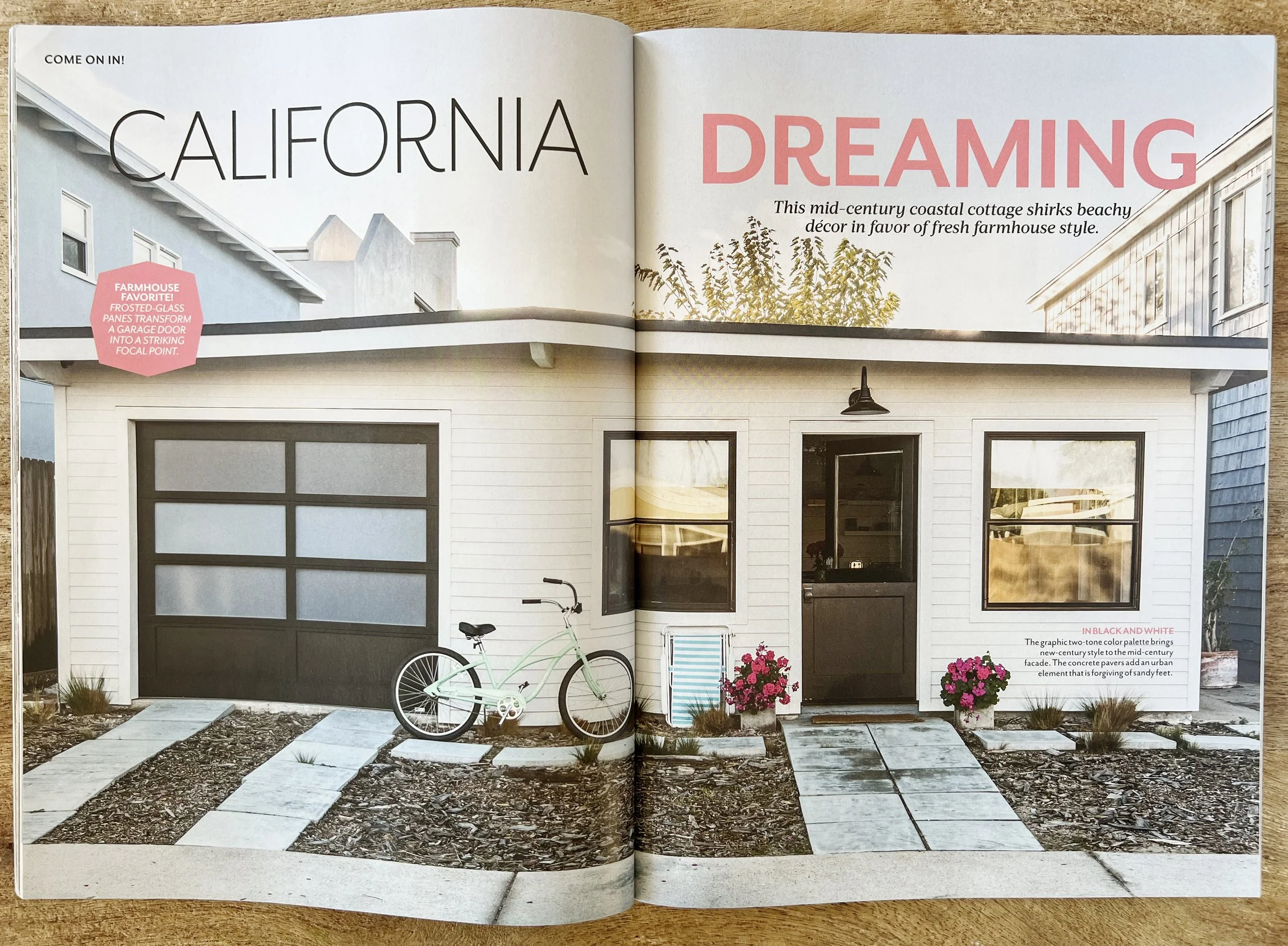 A modern coastal cottage with a white exterior, black-framed windows, a dark garage door, a bicycle parked outside, potted flowers, and a pathway leading to the door.